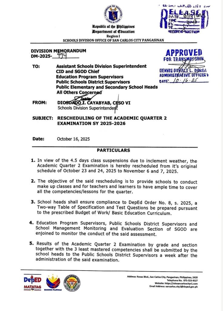 Division Memorandum No. 494 s, 2025 – RESCHEDULING OF THE ACADEMIC QUARTER 2EXAMINATION SY 2025-2026