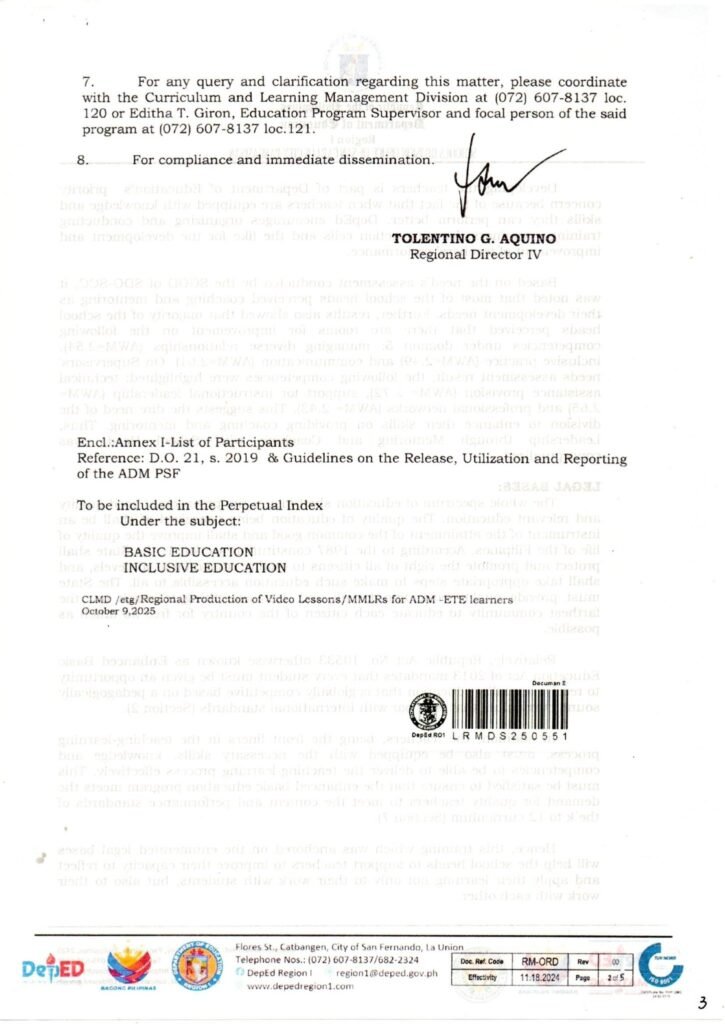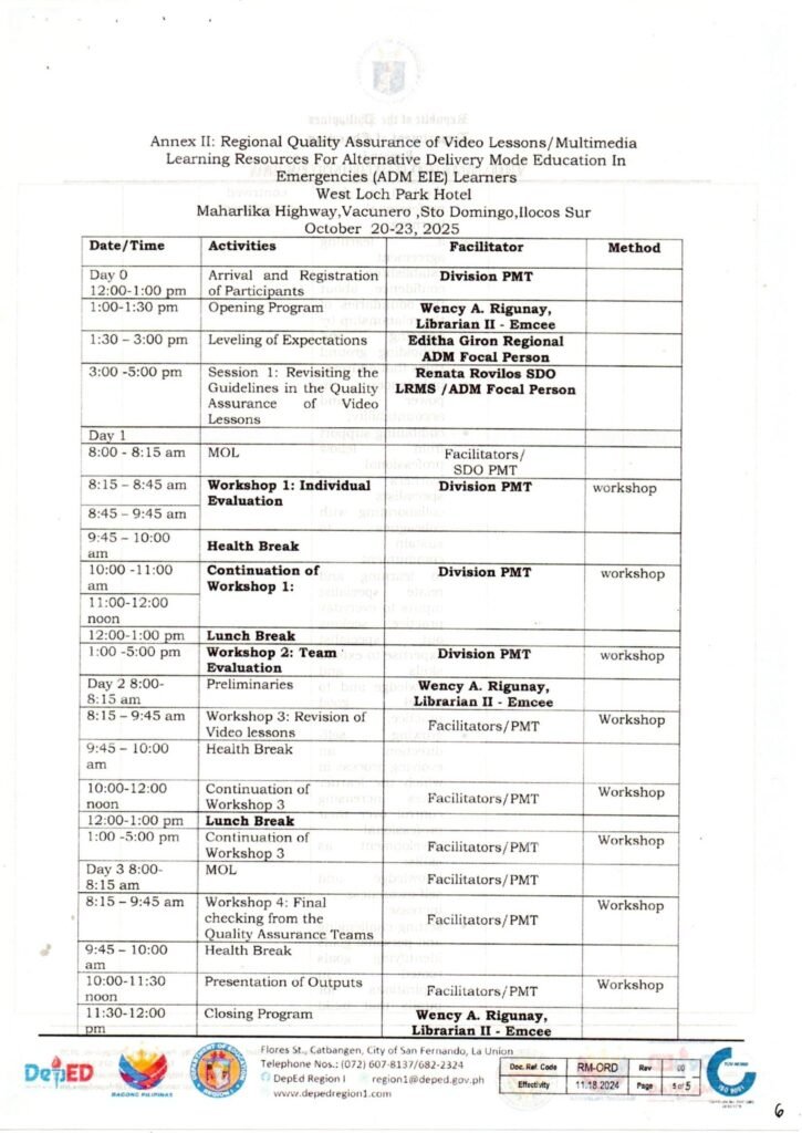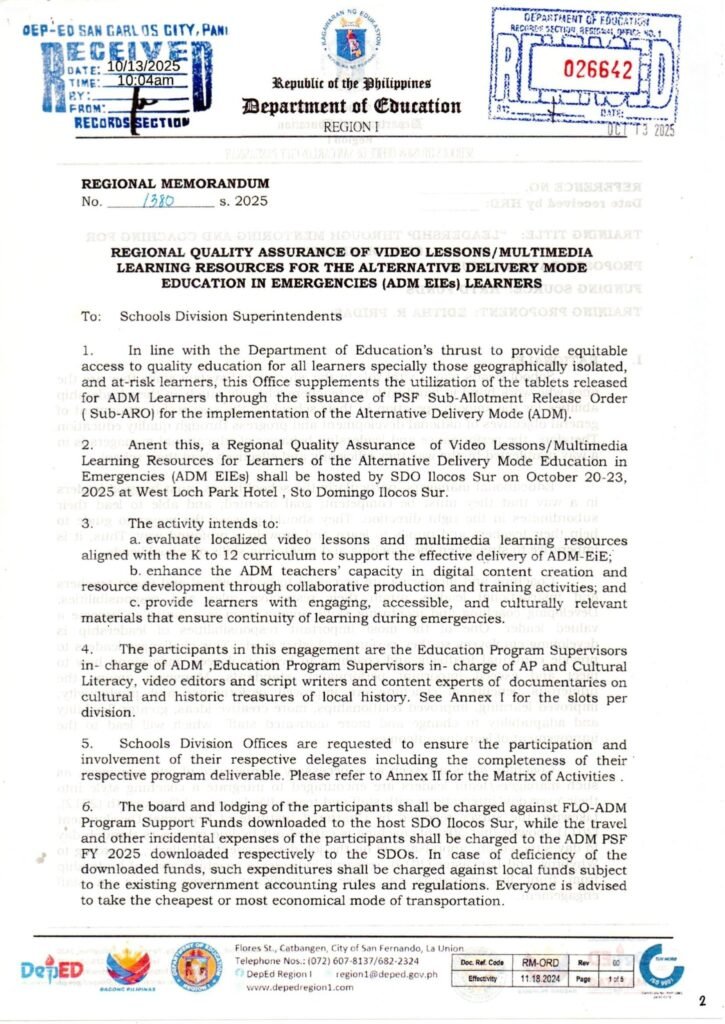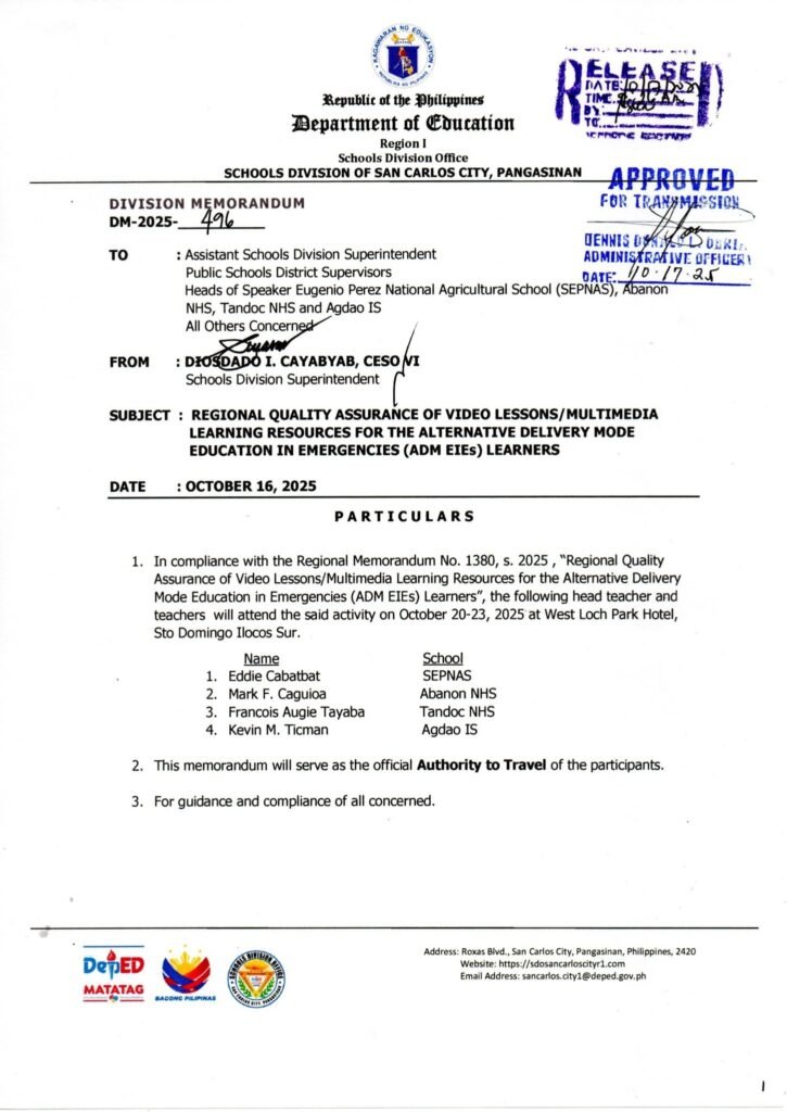 Division Memorandum No. 496 s, 2025 – REGIONAL QUALITY ASSURANCE OF VIDEO LESSONS/ULTIMEDIA LEARNING RESOURCES FOR THE ALTERNATIVE DELIVERY MODE EDUCATION IN EMERGENCIES (ADM EIEs) LEARNERS
