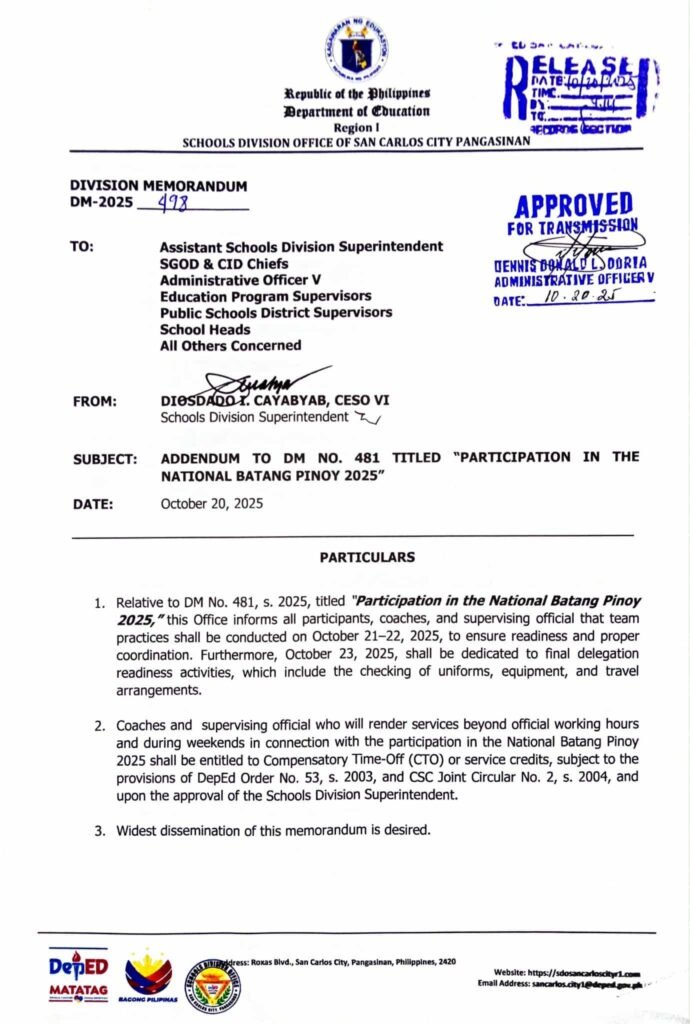 Division Memorandum No. 498 s, 2025 – Addendum to DM No. 481 Titled “Participation in the National Batang Pinoy 2025”