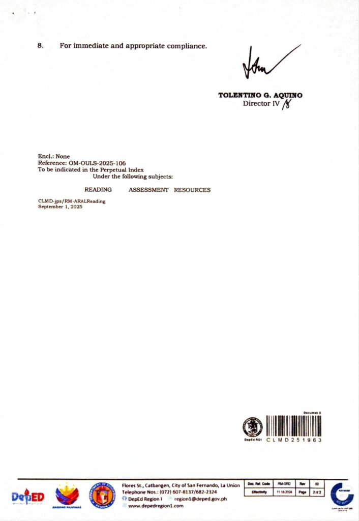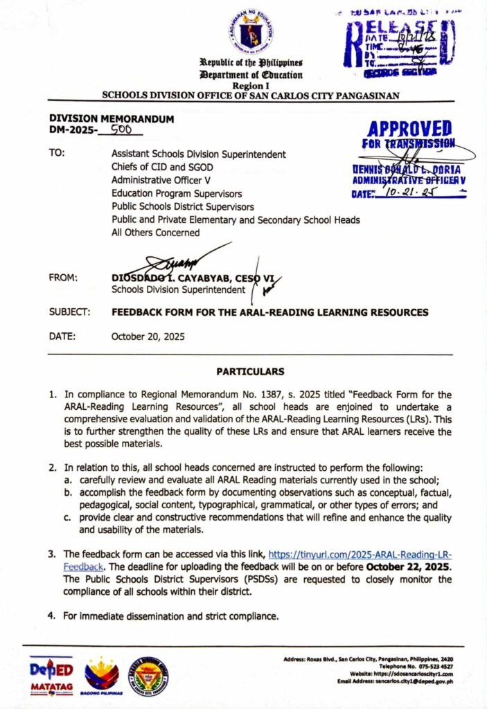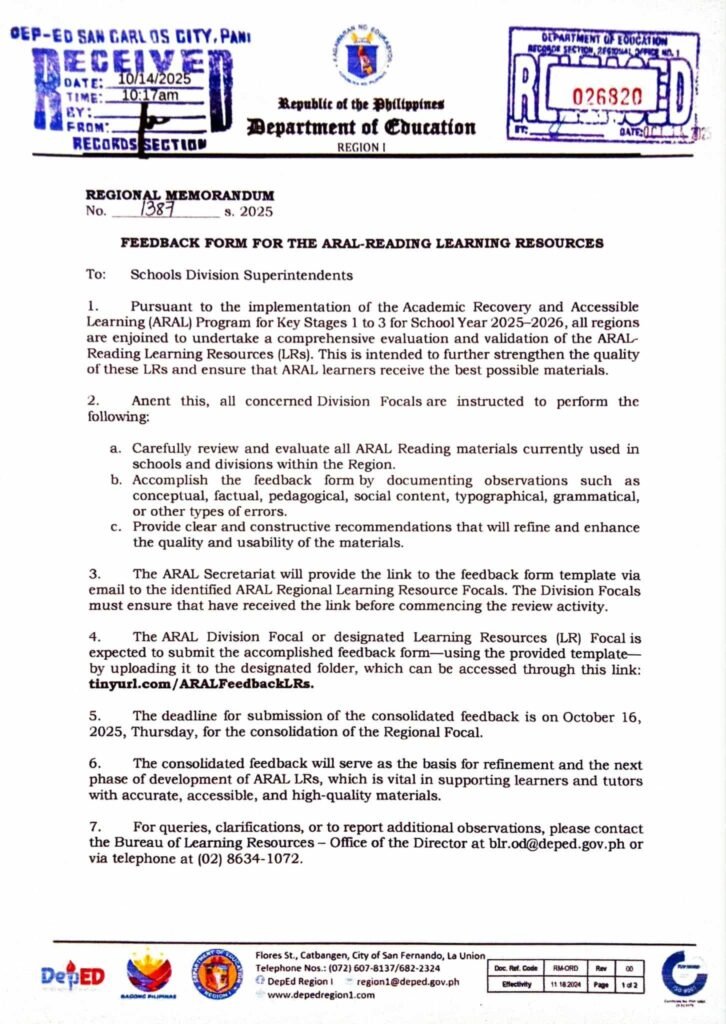 Division Memorandum No. 500 s, 2025 – Feedback Form for the ARAL – Reading Learning Resources