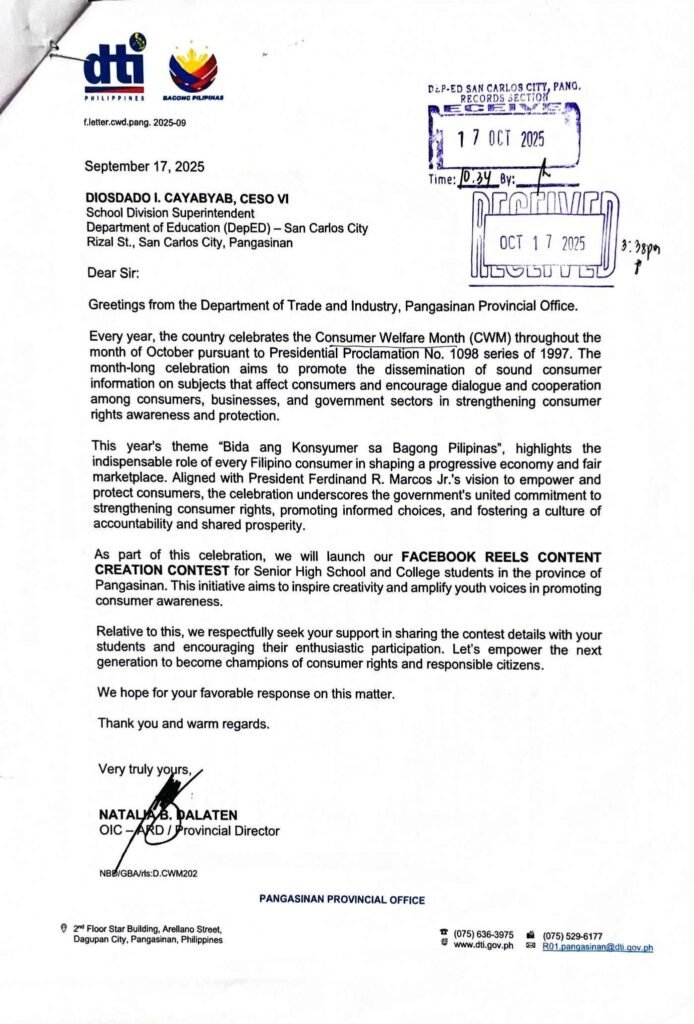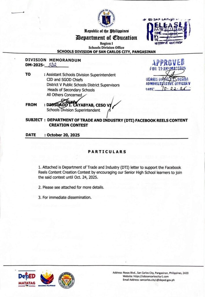 Division Memorandum No. 502 s, 2025 – DEPARTMENT OF TRADE AND INDUSTRY (DTI) FACEBOOK REELS CONTENT CREATION CONTEST