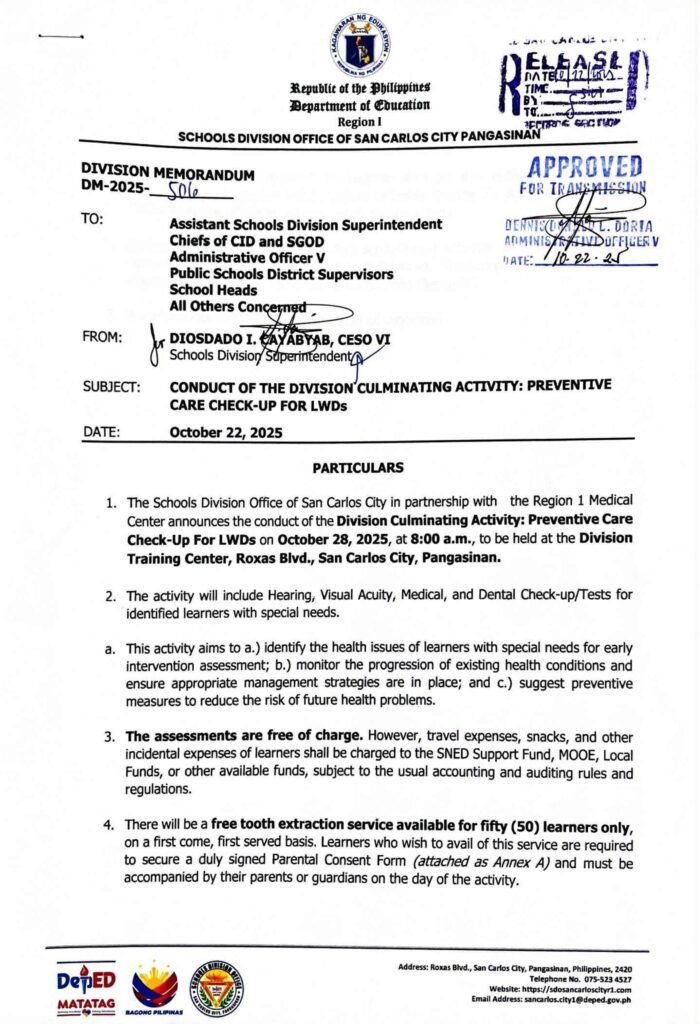 Division Memorandum No. 506 s, 2025 – CONDUCT OF THE DIVISION CULMINATING ACTIVITY: PREVENTIVE CARE CHECK-UP FOR LWDs