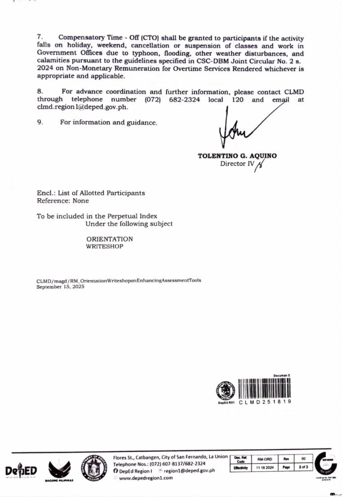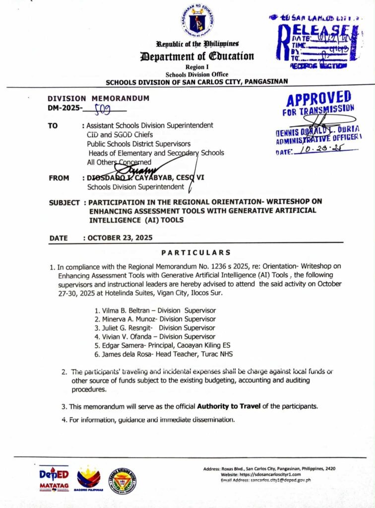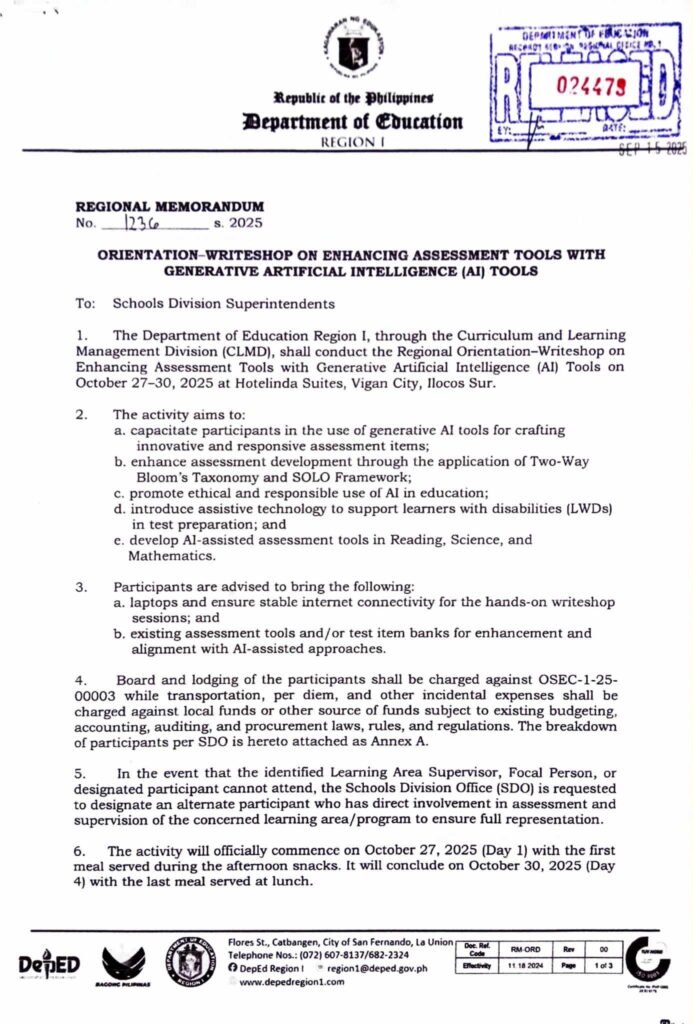Division Memorandum No. 509 s, 2025 – Participation in the Regional Orientation – Writeshop on Enhancing Assessment Tools with Generative Artificial Intelligence (AI) Tools