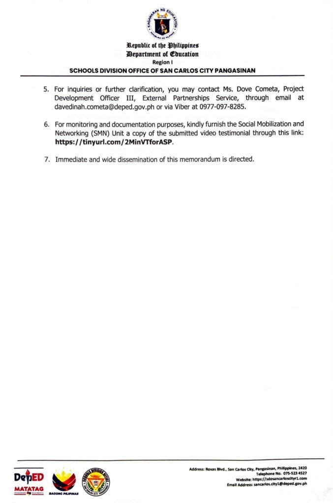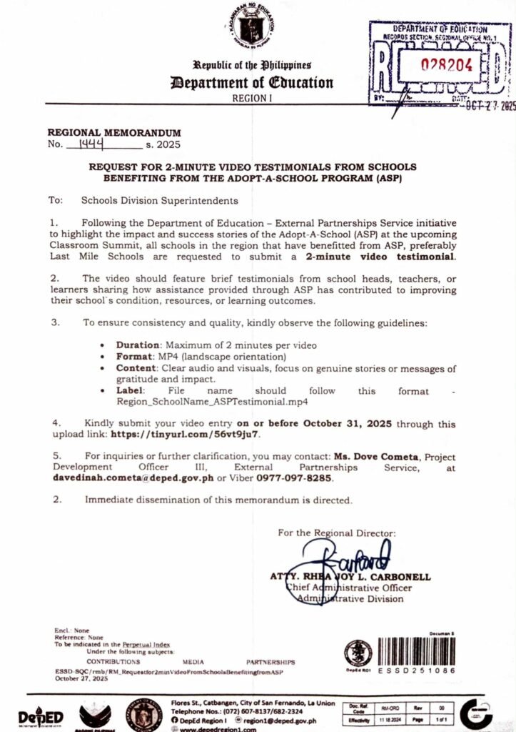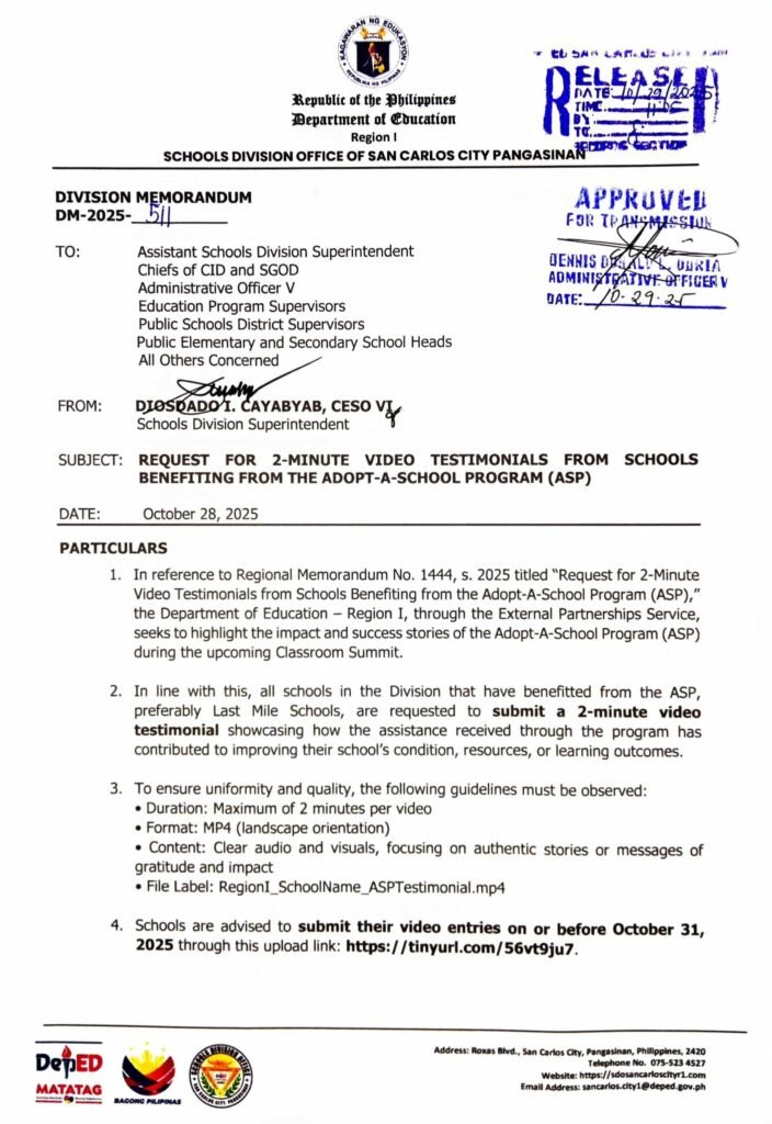 Division Memorandum No. 511 s, 2025 – Request for 2 – Minute Vudeo Testemonials from Schools Benefiting from the Adopt – A- School Program (ASP)