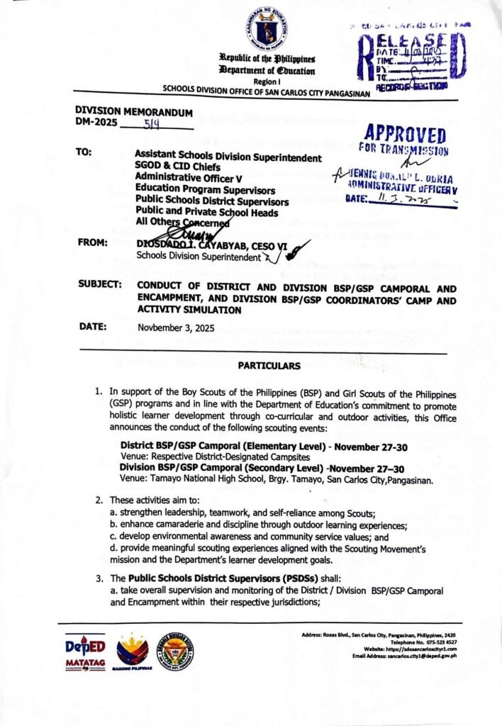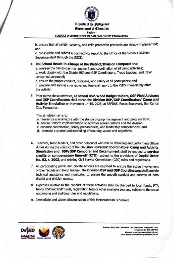 Division Memorandum No. 514 s, 2025 – CONDUCT OF DISTRICT AND DIVISION BSP/GSP CAMPORAL AND ENCAMPMENT, AND DIVISION BSP/GSP COORDINATORS’ CAMP AND ACTIVITY SIMULATION