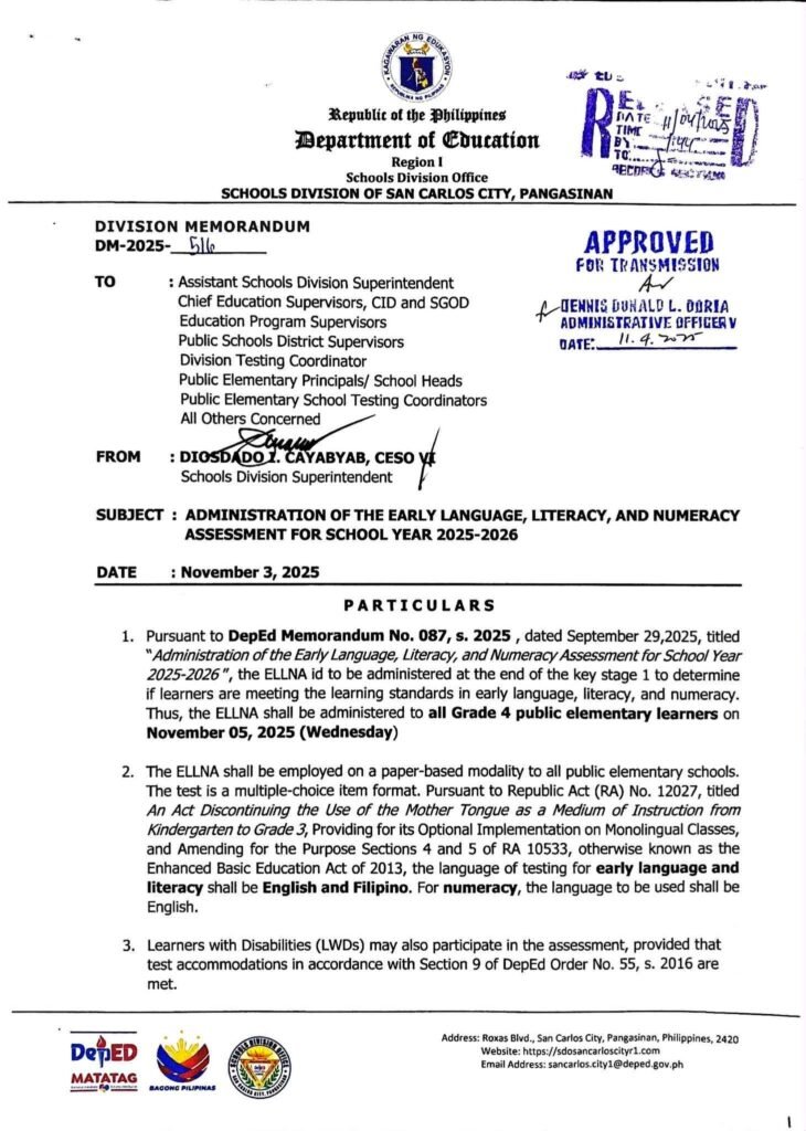 Division Memorandum No. 516 s, 2025 – ADMINISTRATION OF THE EARLY LANGUAGE, LITERACY AND NUMERACY ASSESSMENT FOR THE SCHOOL YEAR 2025-2026