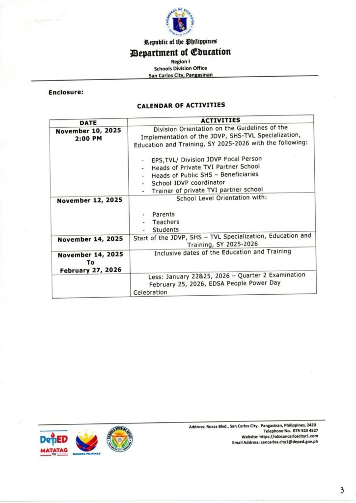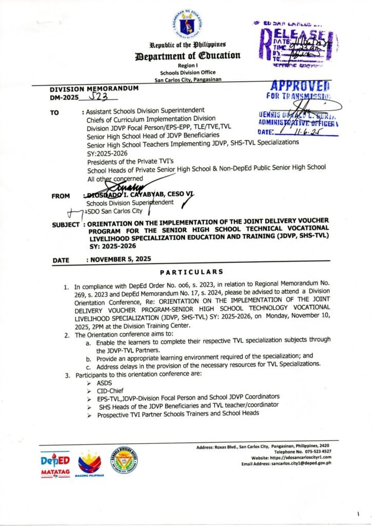 Division Memorandum No. 523 s, 2025 – ORIENTATION ON THE IMPLEMENTATION OF THE JOINT DELIVERY VOUCHER PROGRAM FOR THE SENIOR HIGH SCHOOL TECHNICAL VOCATIONAL LIVELIHOOD SPECIALIZATION EDUCATION AND TRAINING (JDVP, SHS-TVL) SY: 2025-2026