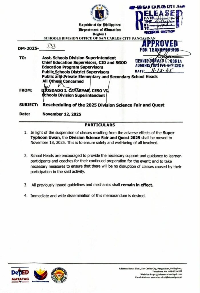 Division Memorandum No. 533 s, 2025 – Rescheduling of the 2025 Division Science Fair and Quest