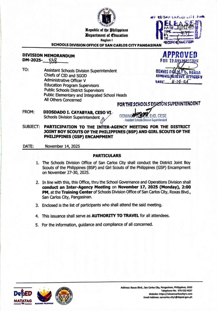Division Memorandum No. 538 s, 2025 – PATRICIPATION TO THE INTER-AGENCY MEETING FOR THE DISTRICT JOINT BOY SCOUTS OF THE PHILIPPINES (BSP) AND GIRL SCOUTS OF THE PHILIPPINES (GSP) ENCAMPMENT