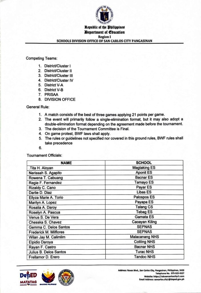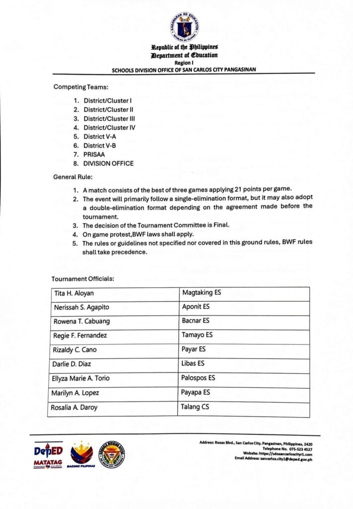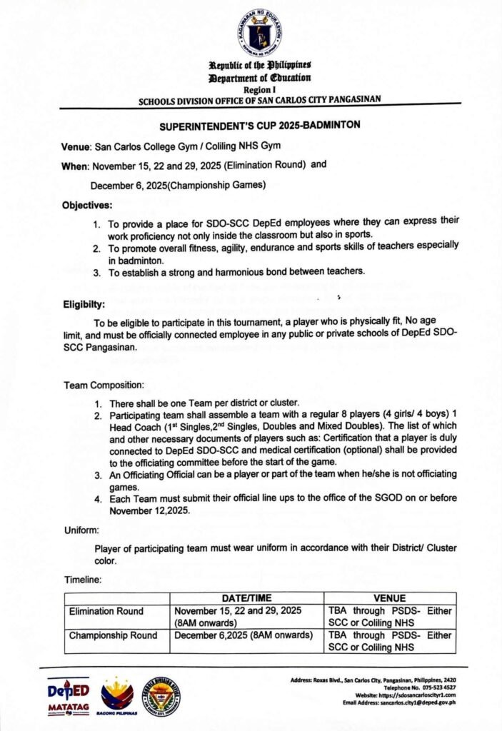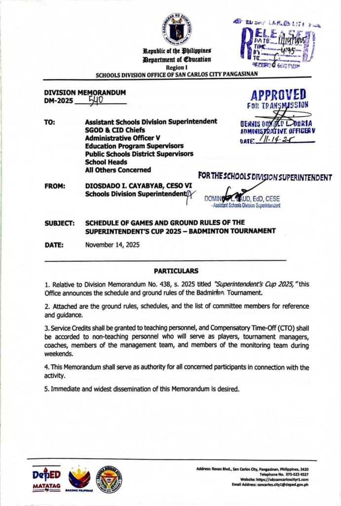 Division Memorandum No. 540 s, 2025 – SCHEDULE OF GAMES AND GROUND RULES OF THE SUPERINTENDENT’S CUP 2025 – BADMINTON TOURNAMENT