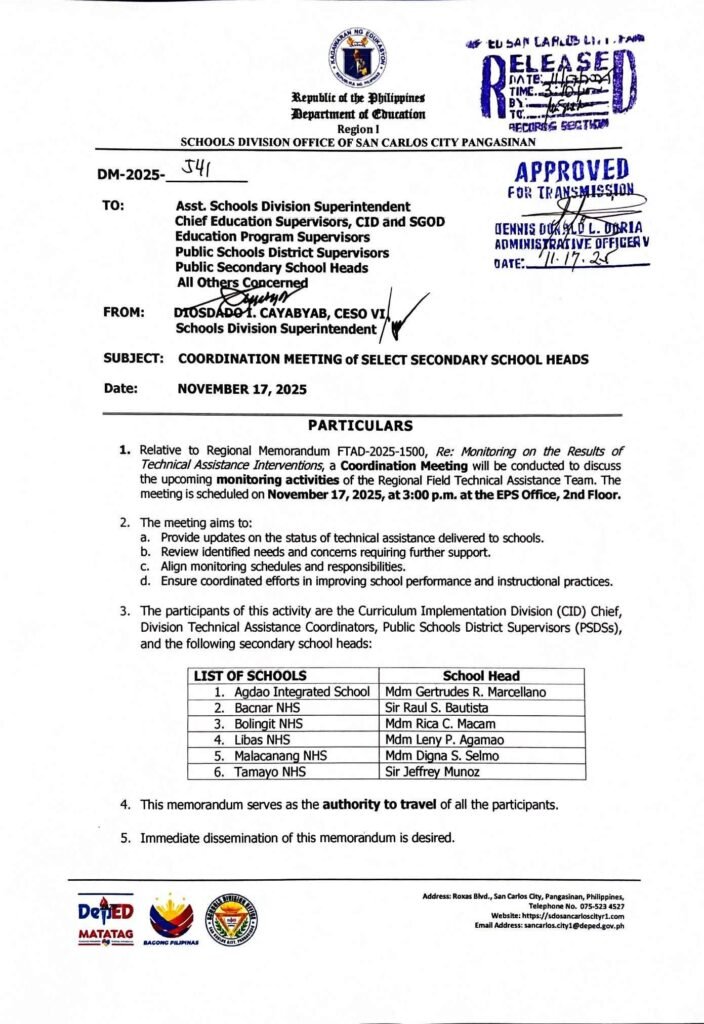 Division Memorandum No. 541 s, 2025 – COORDINATION MEETING of SELECT SECONDARY SCHOOL HEADS
