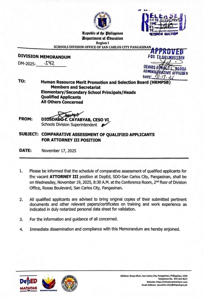 Division Memorandum No. 542 s, 2025 – COMPARATIVE ASSESSMENT OF QUALIFIED APPLICANTS FOR ATTORNEY III POSITION