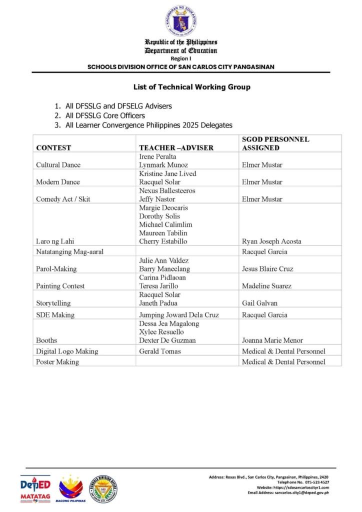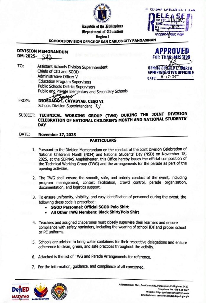 Division Memorandum No. 543 s, 2025 – TECHNICAL WORKING GROUP (TWG) DURING THE JOINT DIVISION CELEBRATION OF NATIONAL CHILDREN’S MONTH AND NATIONAL STUDENTS’ DAY