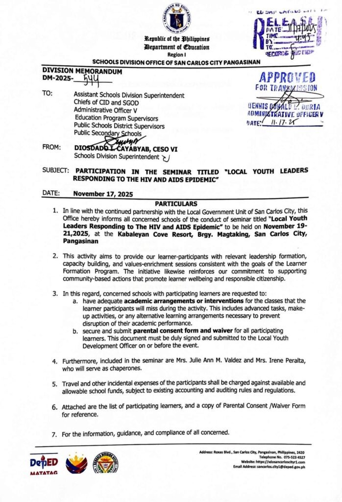 Division Memorandum No. 544 s, 2025 – PARTICIPATION IN THE SEMINAR TITLED “LOCAL YOUTH LEADERS RESPONDING TO THE HIV AND AIDS EPIDEMIC”