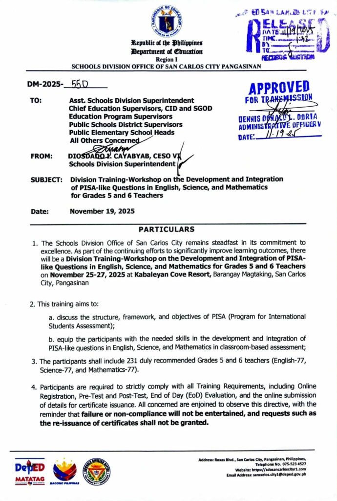 Division Memorandum No. 550 s, 2025 – Division Training-Workshop on the Development and Integration of PISA-like Questions in English, Science, and Mathematics for Grades 5 and 6 Teachers