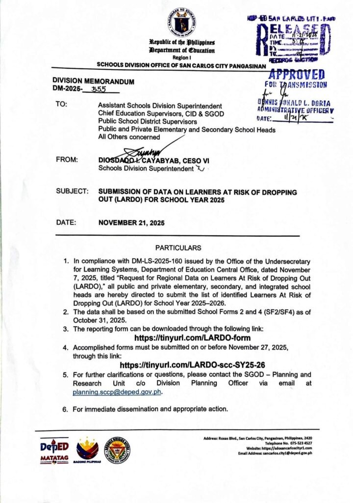 Division Memorandum No. 555 s, 2025 – SUBMISSION OF DATA ON LEARNERS AT RISK OF DROPPING OUT (LARDO) FOR SCHOOL YEAR 2025