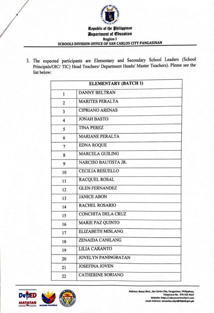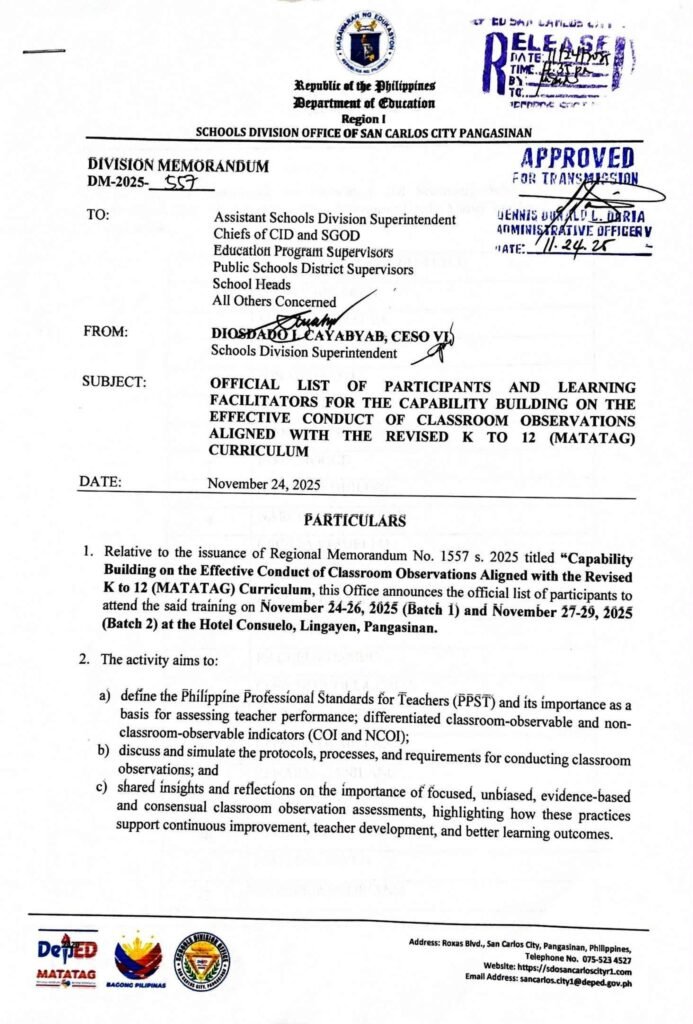 Division Memorandum No. 557 s, 2025 – OFFICIAL LIST OF PARTICIPANTS AND LEARNING FACILITATORS FOR THE CAPABILITY BUILDING ON THE EFFECTIVE CONDUCT OF CLASSROOM OBSERVATIONS ALIGNED WITH THE REVISED K TO 12 (MATATAG) CURRICULUM