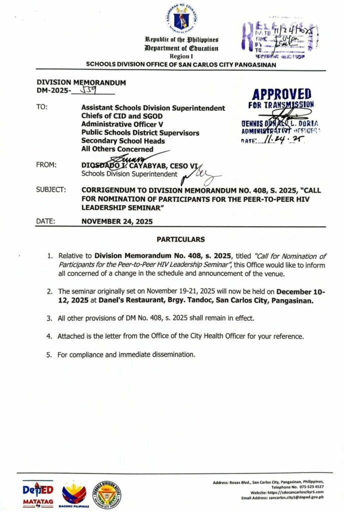 Division Memorandum No. 559 s, 2025 – Corrigendum to Division Memorandum No. 408 s, 2025 ” Call for Nomination of Participants for the Peer-to-Peer HIV Leadership Seminar”