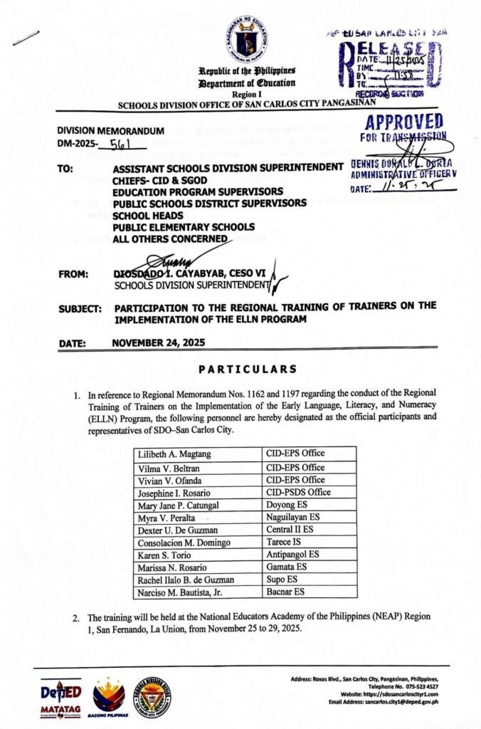 Division Memorandum No. 561 s, 2025 – PARTICIPATION TO THE REGIONAL TRAINING OF TRAINERS ON THE IMPLEMENTATION OF THE ELLN PROGRAM