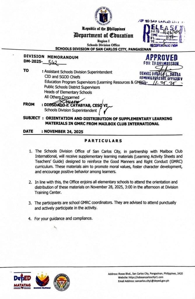 Division Memorandum No. 562 s, 2025 – ORIENTATION AND DISTRIBUTION OF SUPPLEMENTARY LEARNING MATERIALS IN GMRC FROM MAILBOX CLUB INTERNATIONAL