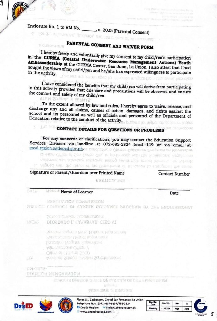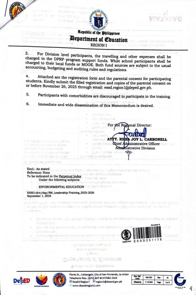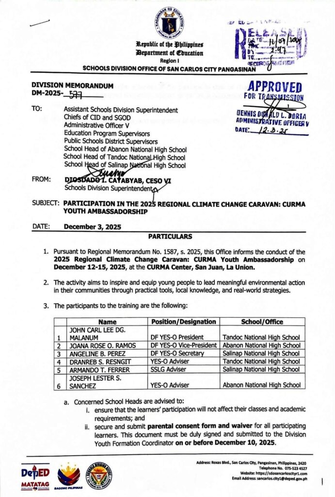 Division Memorandum No. 577 s, 2025 – PARTICIPATION IN THE 2025 REGIONAL CLIMATE CHANGE CARAVAN: CURMA YOUTH AMBASSADORSHIP