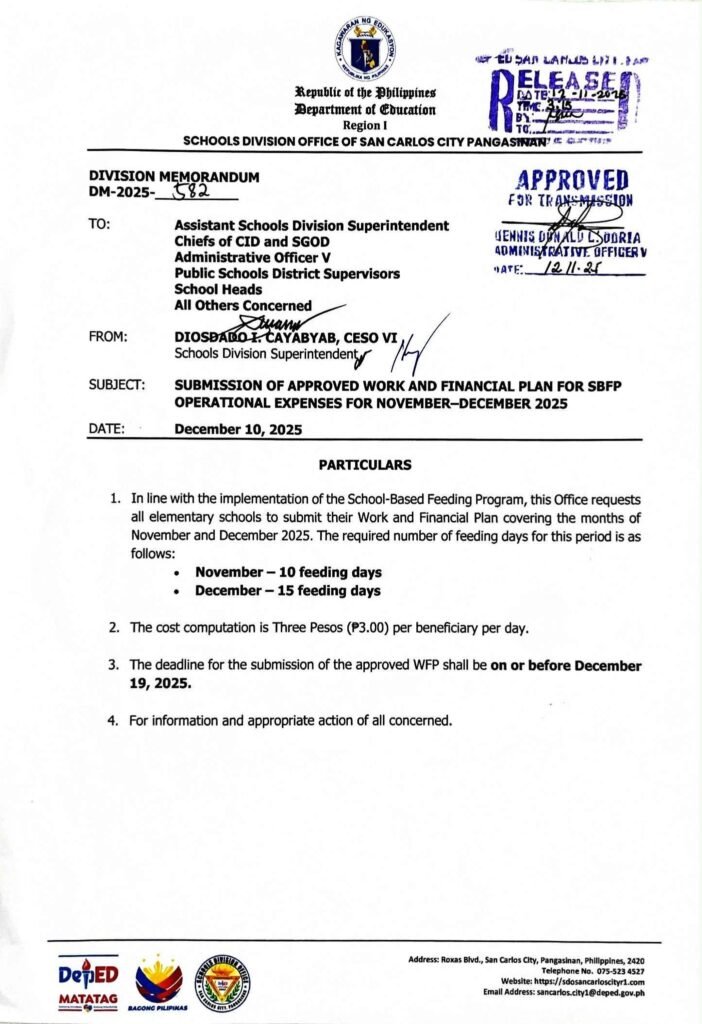 Division Memorandum No. 582 s, 2025 – SUBMISSION OF APPROVED WORK AND FINANCIAL PLAN FOR SBFP OPERATIONAL EXPENSES FOR NOVEMBER-DECEMBER 2025