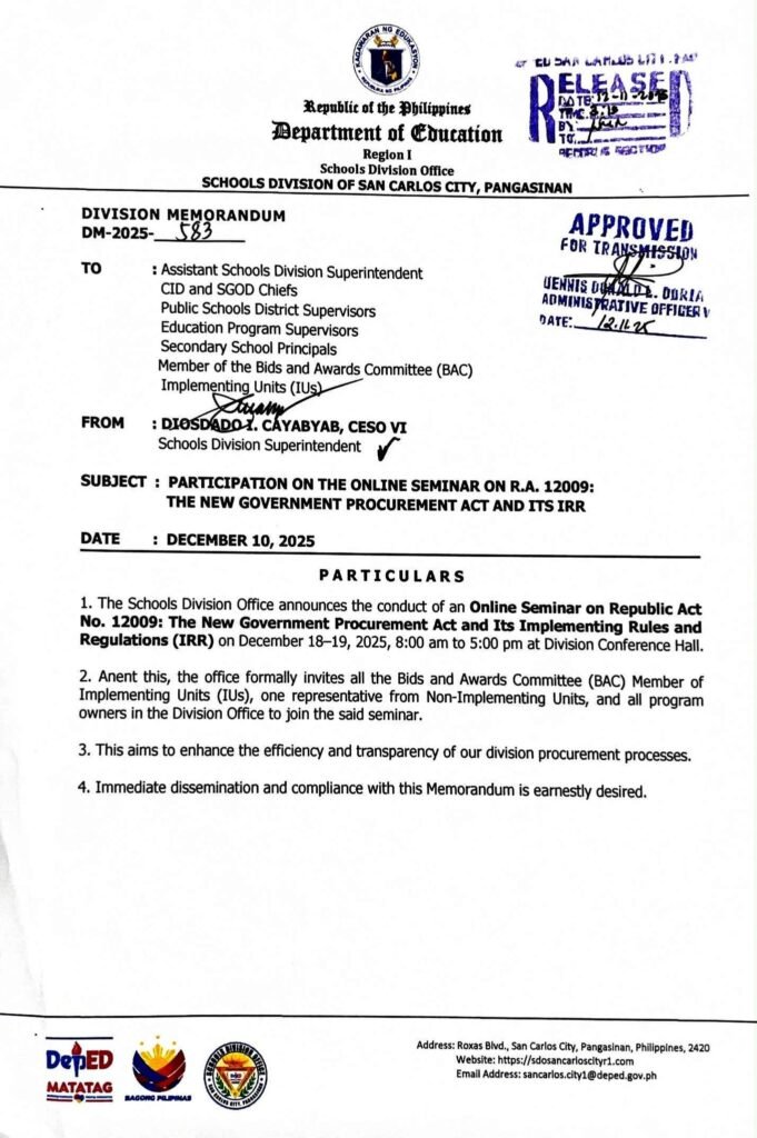 Division Memorandum No. 583 s, 2025 –PARTICIPATION ON THE ONLINE SEMINAR ON R.A. 12009: THE NEW GOVERNMENT PROCUREMENT ACT AND ITS IRR
