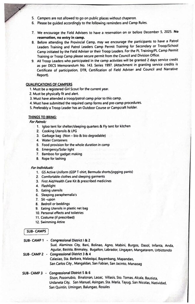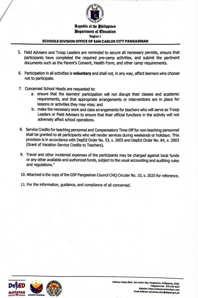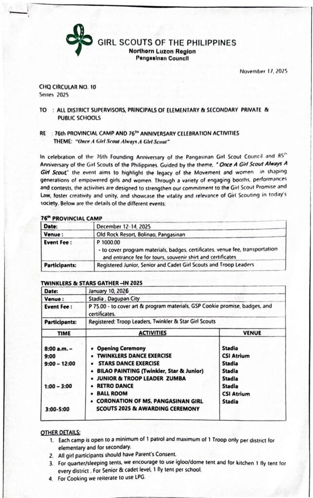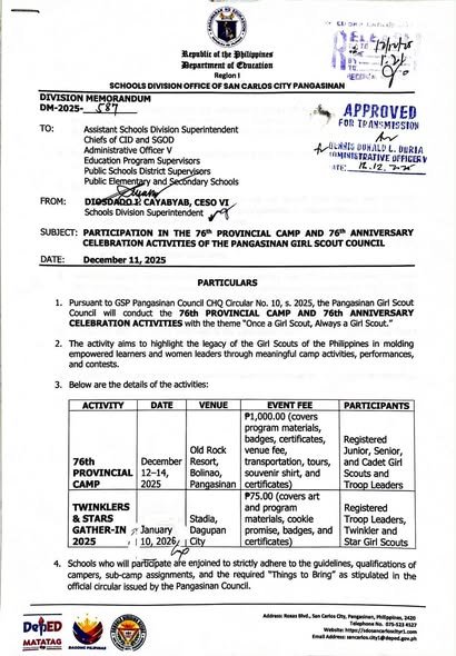 Division Memorandum No. 587 s, 2025 –PARTICIPATION IN THE 76th PROVINCIAL CAMP AND 76th ANNIVERSARY CELEBRATION ACTIVITIES OF THE PANGASINAN GIRL SCOUT COUNCIL