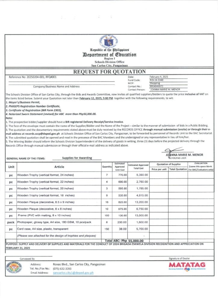2025-02-04-001-RFQ#001- SUPPLY AND DELIVERY OF SUPPLIES AND MATERIALS FOR THE CONDUCT OF 2024 BRIGADA ESKWELA DIVISION RECOGNITION AND APPRECIATION ON FEBRUARY 21, 2025